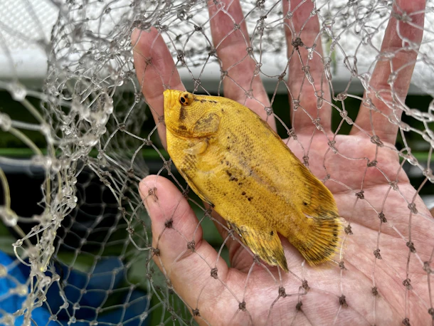 ▼海水魚を飼育している魚好きkidsたっての希望でマツダイを網でつかまえました。