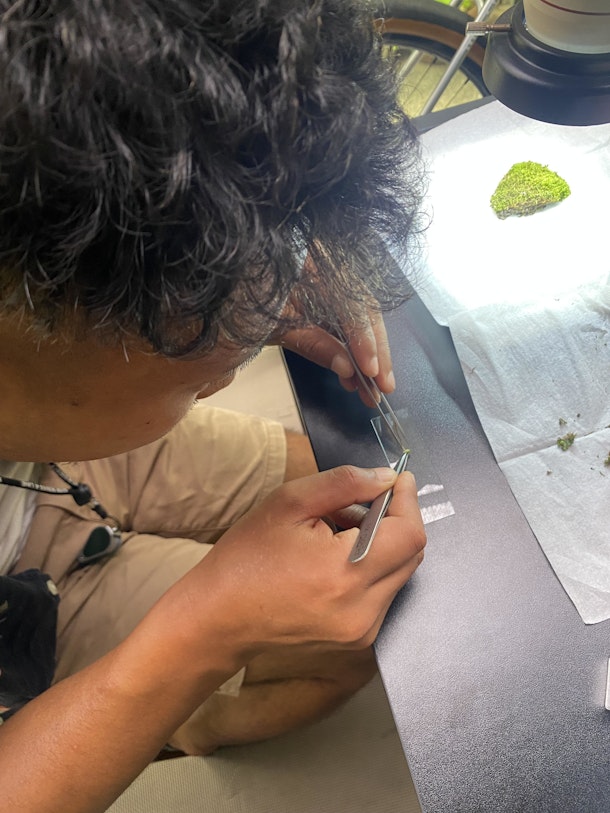 先のとがったピンセットを2本使用してプレパラートを作成しますが、小さなコケの葉をとるのはなかなか大変です。