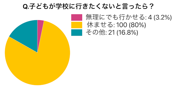 80%(100人)が「休ませる」と回答しました。「無理にでも行かせる」は約3.2%(4人)でした。その他が16.8%(21人)。