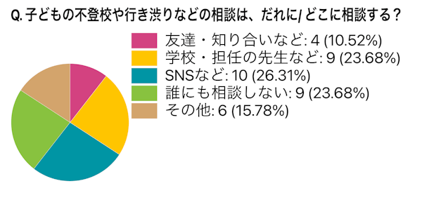 💬『親の会や同じ学びをしている仲間のコミュニティ、学校のスタッフ、居場所のスタッフなど。でも基本的には不安に思っていないので相談することはない。』