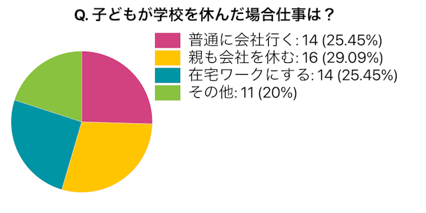 約29%(16人)が「親も会社を休む」と回答しました。「普通に会社行く」「在宅ワーク」はそれぞれ約25%(14人)で同じ比率。その他が20%(11人)。