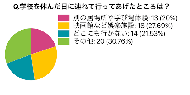 「映画館や遊園地など娯楽施設」が約28%(18人)、「その他」は約31%(20人)、「どこにも行かない」が約22%(14人)、「フリースクールなど別の居場所や学び場体験」が約20%(13人)でした。