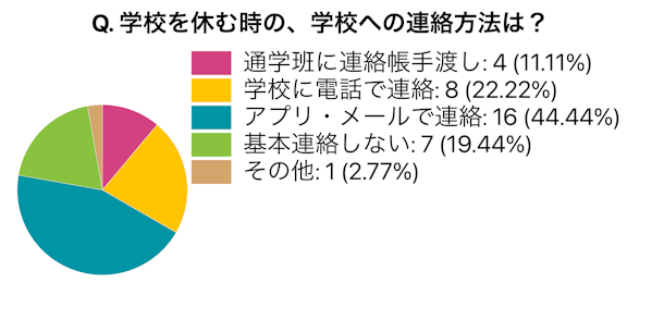 約44%(16人)が「アプリ・メール等で連絡」と回答しました。「学校に電話で連絡」は約22%(8人)。基本連絡しない(行く時だけ連絡する)が約19%(7人)、「通学班に連絡帳手渡し」が約11%(4人)、その他が約3%(1名)でした。