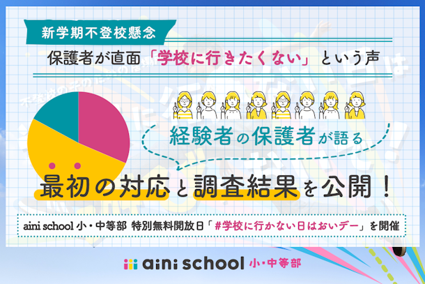 この時期、新学期を迎えるにあたり子どもが「学校に行きたくない」 と行き渋り・不登校傾向にある保護者の皆さんに、お子さんが不登校を経験した保護者がまずは最初に考えたこと・やったことを、aini school 小・中等部の運営メンバーによりTwitter(X)と、aini school 小・中等部にお子さんを通わせる保護者にアンケート調査を実施いたしましたので、その結果をこちらでご紹介いたします。アンケートにご回答いただきましたみなさま、誠にありがとうございました。