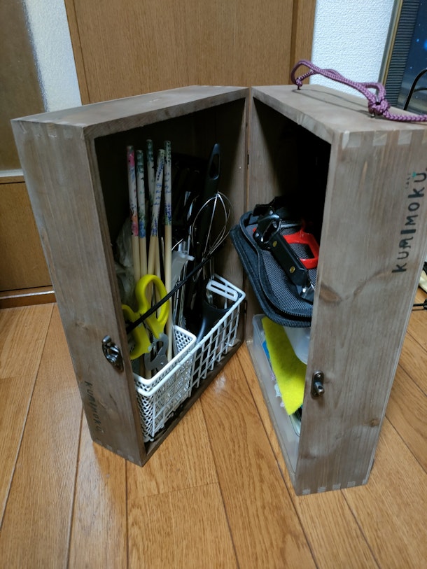 周りの箱と金具の一部だけ買って来てあとは家にあったものです。