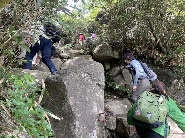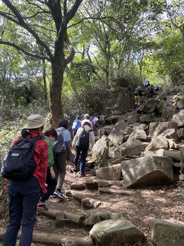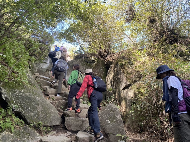 途中の登山路は、先頭が危ないところを注意して後に伝えながら、転ばないように焦らずゆっくり歩きます。