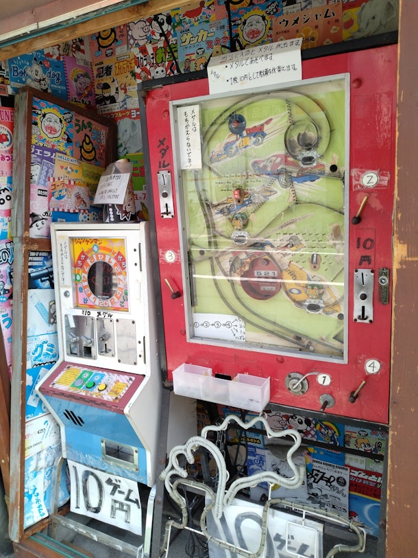まず、外観にはホーロー看板マニア大喜び⁉の「キンチョール」や「たばこ」の看板があり、10円で楽しめるレトロボードゲーム⁉が我々を出迎えてくれる。