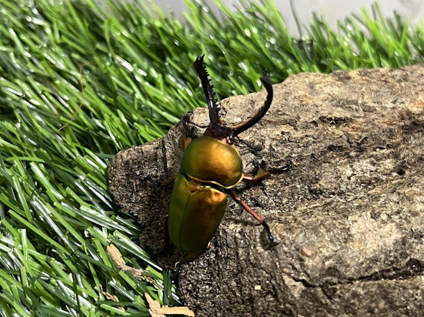 キンイロクワガタというだけあってメタリックに輝くクワガタ。とても小さくてかわいらしいクワガタです。青っぽい色や緑っぽいやつなど色々な色がいます