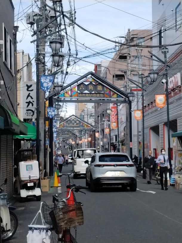 「六角橋商店街」は、白楽駅側から六角橋交差点までの約500ⅿの商店街で、付属として数多くの路地が網の目のように存在する。その路地の一部はアーケード商店街になっていて、アーケード商店街内のお店看板などはかなり古い物が飾られている。