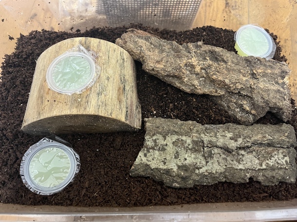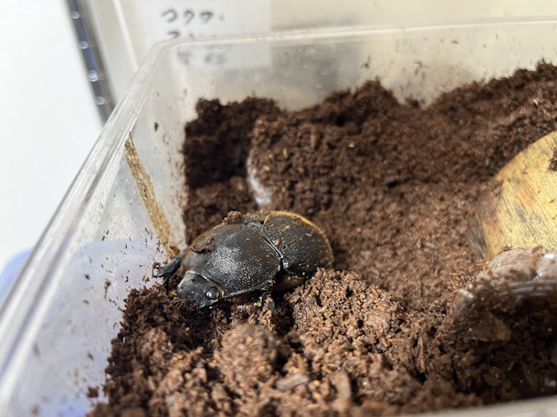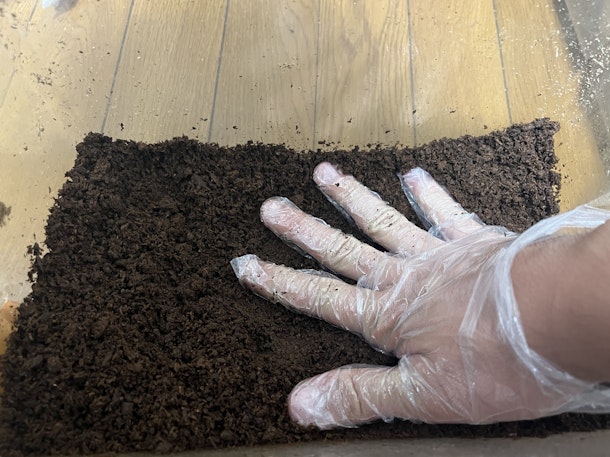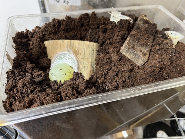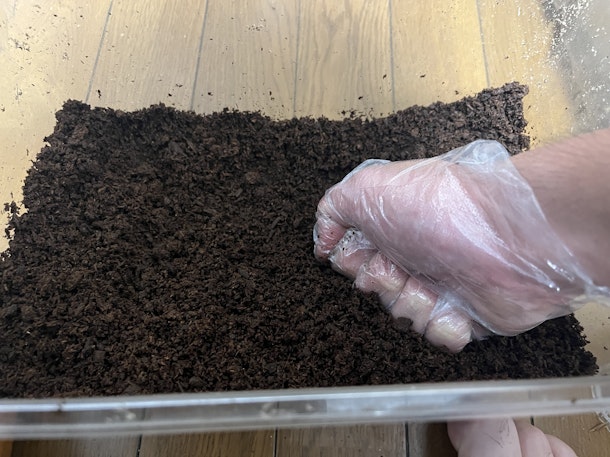 ケースに土を敷きます。ポイントは✊固く押し固めること。こうすることでメスが卵を産みやすくなります。