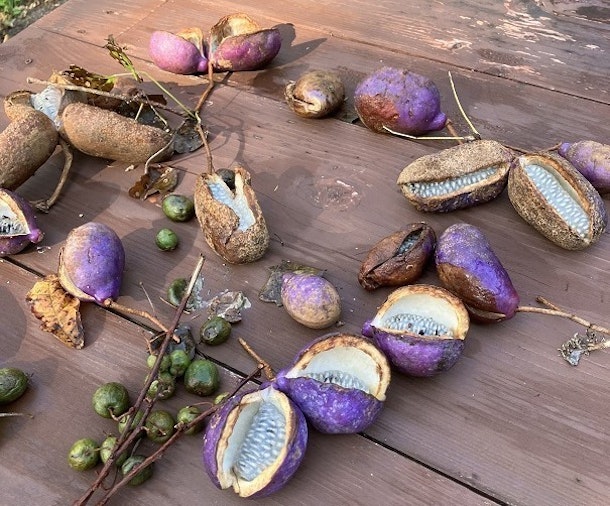 しばらく前に採ったアケビとサルナシ(小さなキーウィ)。外のテーブルに出しておいたら結局シカの家族とスズメバチが食べてしまいました。これらの実のどこかにハチが隠れているかもしれません。