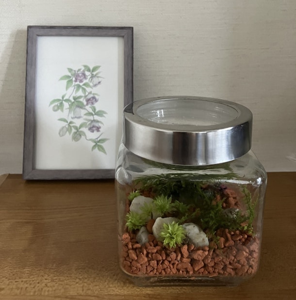 冬に向かい、元気を取り戻している植物もいます。コケもその一つ。早速家に入れてみました。コケの多くはあまり強い光や乾燥は苦手なのです。やっと緑を回復。こんな風にも楽しめます。後ろの絵はツルニンジン。