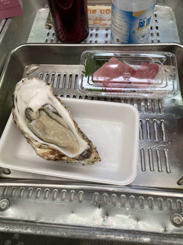 昔ながらの魚屋さん的な店の軒先でマグロ中トロと生ガキ。