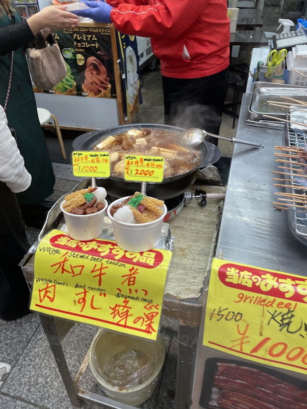 外国人をはじめ観光客が多く、たべ歩きが流行ってる。最近の築地場外と同じような構造ですね。