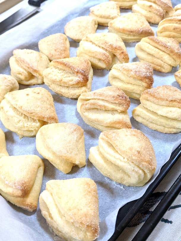 カッテージチーズをブレンダーでペスト状にする。 大き目のホウルに小麦粉、塩、ベーキングパウダーと一緒に振るう。一口に切ったマーガリンを加え、手で素早く小麦粉とこすり合わせる。 更にカッテージチーズとスメタナを加え、生地をこねる。 出来上がった生地を冷蔵庫に入れ、20分程度冷やす。 生地を丸く、薄く(5㎜)まで伸ばす。コップで型を取る。お皿にグラニュー糖を入れる。クッキーをお皿に入れグラニュー糖をつける。
