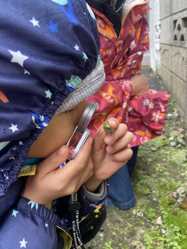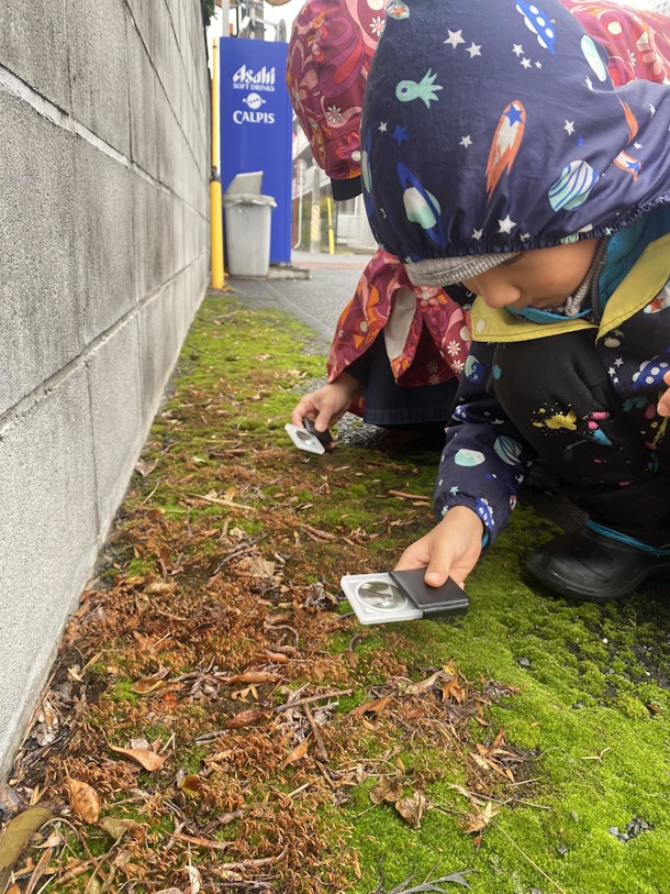 まずはお母さまと虫めがねで道端のコケを観察していただきます。