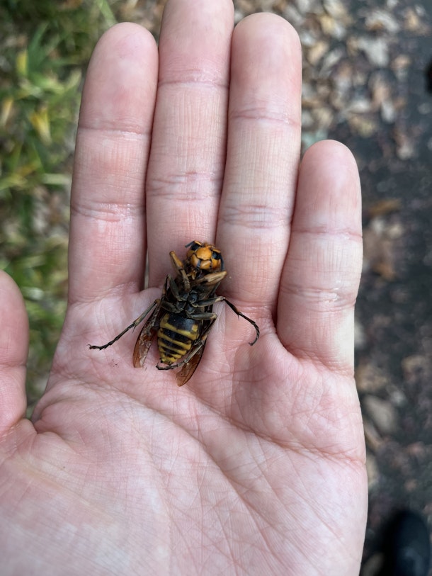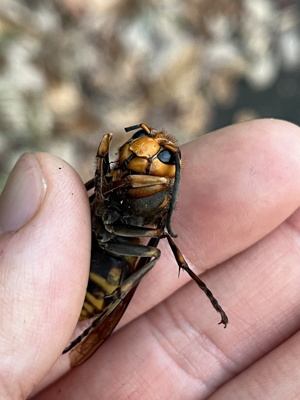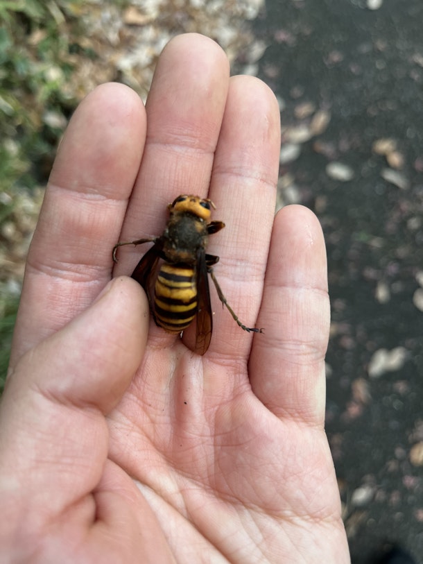 スズメバチが落ちていました。もう死んでしまっていますね。でもこのハチ普通とは違うことに気づきました。わかりますか?