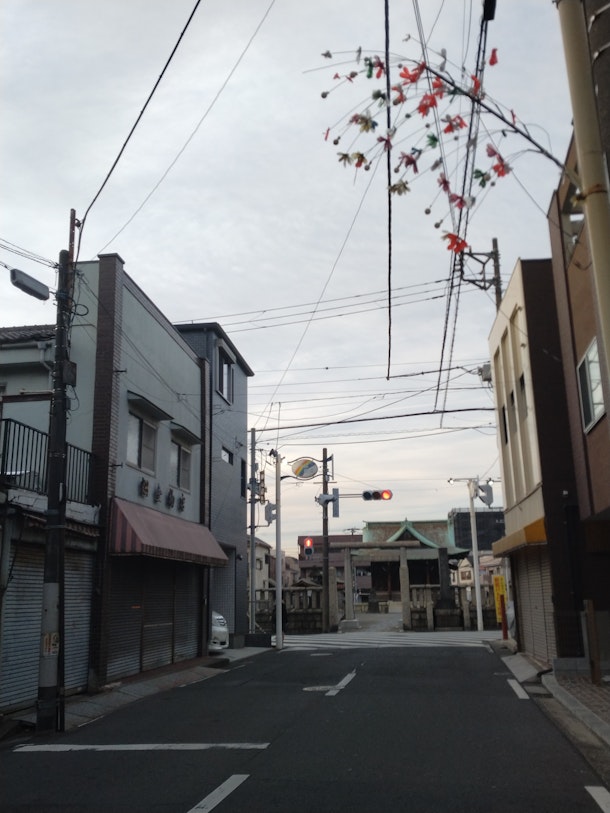 駅近くの商店街を探しても市場は見つからない。奥にあるのは熊野神社。