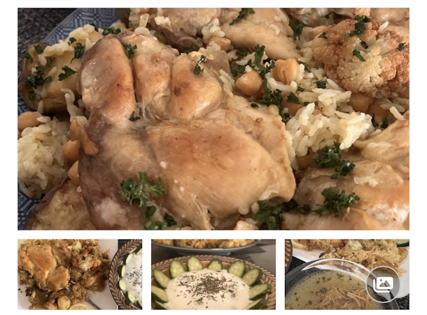 マクルーバとは、アラビア語で「ひっくり返すمقلوبة」という意味がある中東(シリヤ、パレスチナ、ヨルダン、イラクなど)のお料理です。炊き込んだご飯を大きなお皿の上に一気にひっくり返して完成させます。完成したら、家族全員がその様子を見に集まるほど、楽しくてワクワクする瞬間。今回ご紹介マクルーバはパレスチナ式です。鶏肉と、ナス、カリフラワー、ジャガイモなどの野菜と一緒に、スパイスで味をつけて炊きます。