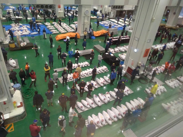 この年は、豊洲市場移転後初の初セリ。歴史に残る初セリですね。