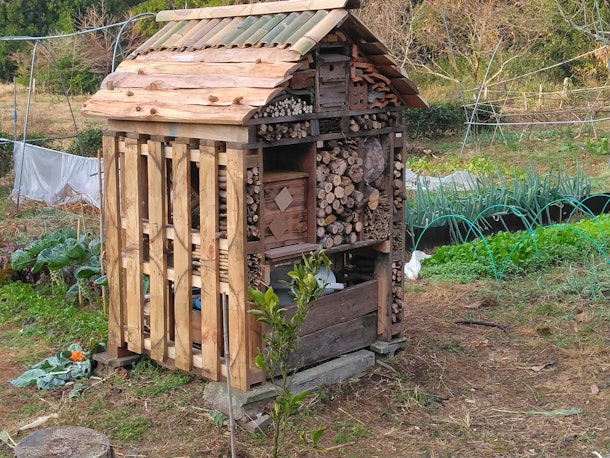 害虫を駆除するため、農薬を散布するとカマキリやテントウムシ、ミツバチ等の益虫も少なくなり、生態系のバランスが崩れます。インセクトホテル=虫たちの越冬・繁殖の為のホテルです。生態系が豊かになることで野菜や果樹が豊富に実り美味しくなります。農薬や化学肥料に頼らない自然な野菜作りを目指しています。美味しく安全な野菜や果物を収穫し味わってください。
