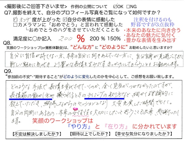 今回の開催は、aini 以外の場でご縁をいただいたお客様なので、レビューがありませんので、先に、ご感想を書いていただいたアンケート用紙をご紹介いたします。