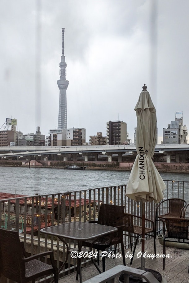 先日東京にも初雪が♪ こちらの写真は、ワークショップを終え、更に浅草地下街の隠れ家バーでの乾杯を終えた後のスカイツリー写真。