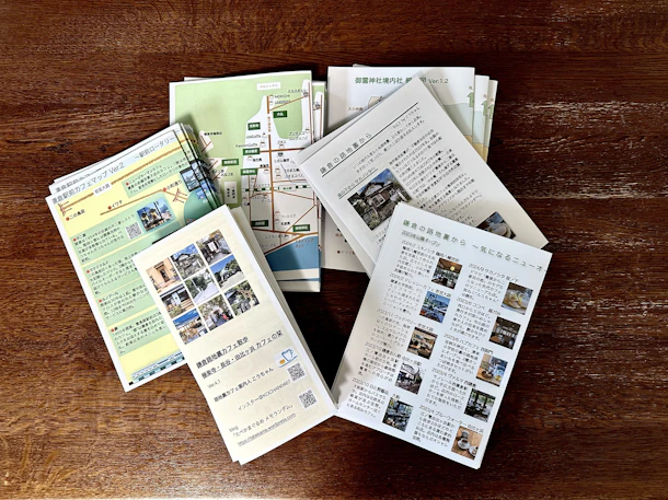 ツアー当日にご紹介しきれないといけないので.....、 ・トピックやカフェ散歩ノウハウをミニコミ誌的に記した「鎌倉の路地裏から」や ・「2022-24年 ニューオープンの気になるカフェ20店」 などのパンフ作成に取り組んでおります。