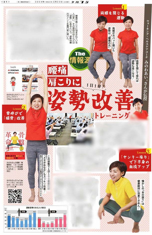 読者層の中年男性向けに「腰痛」「肩こり」「姿勢改善」をテーマにお話しさせていただいております。お忙しい世代でもあるので、タイパを意識した「1日1分〜」で取り組める簡単なレッスンのご紹介ですので、ぜひトライしてみてくださいね。