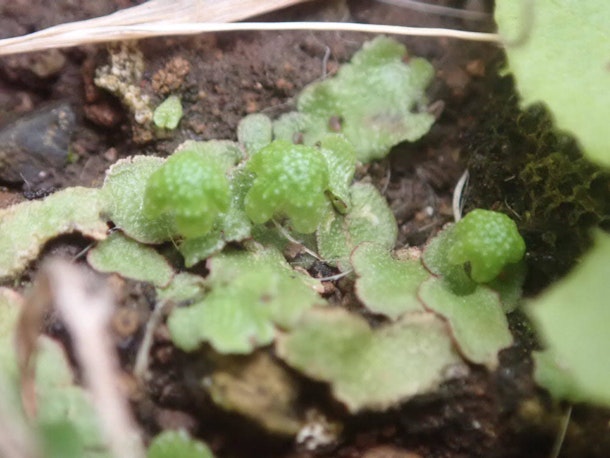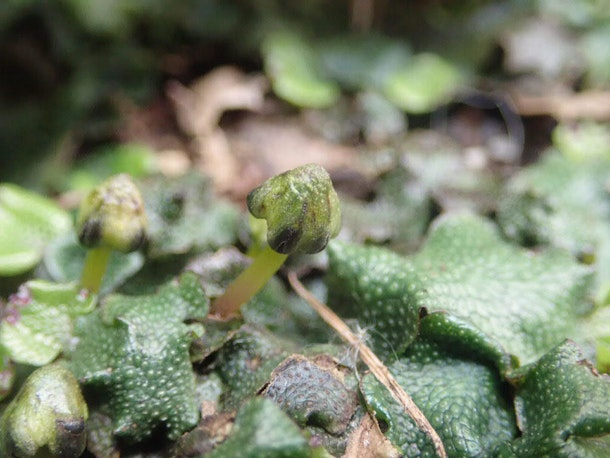 どこにでも生えているジャゴケ!こんな風に葉の間からにょきにょきと生えています。