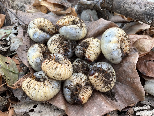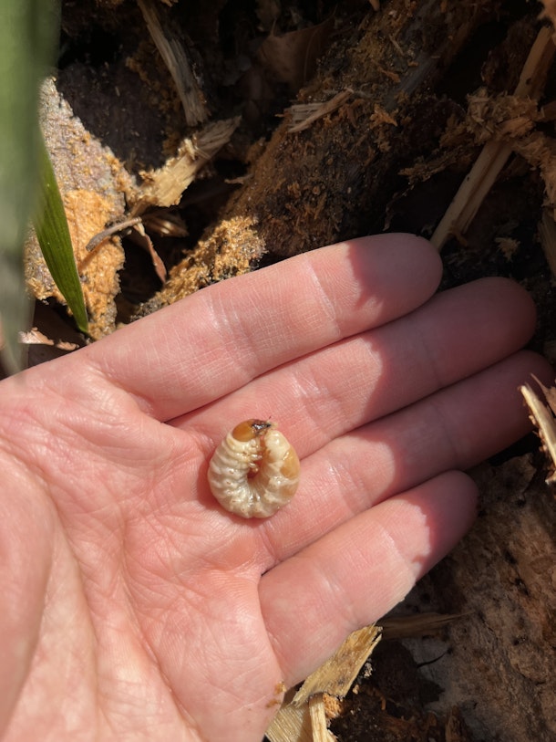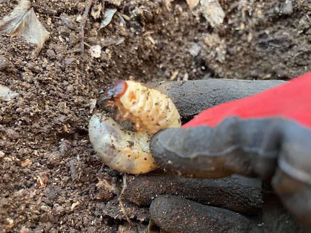 頭が黒っぽく、からだが大きいのはカブトムシの幼虫です。あちこち探すと、たくさん見つかりました。