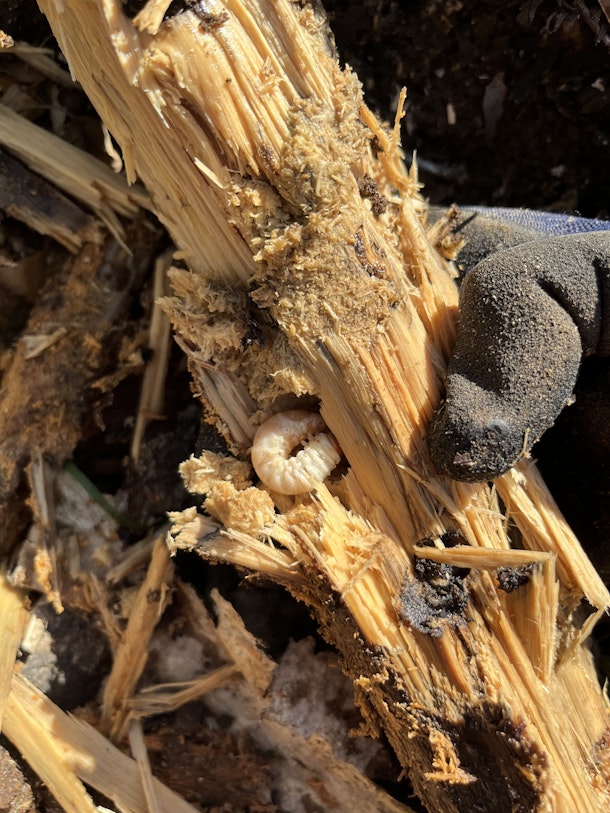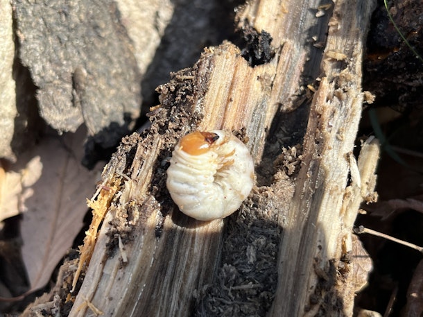 頭がオレンジ色で小さめの幼虫はクワガタです。朽ちた木の中にいます。