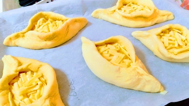 ふわふわのパン生地に、卵を一個まるごと乗せる。とろりチーズたっぷりの焼きたてをガブリと食べると、美味しいです。