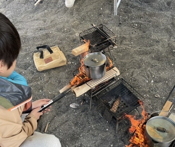 焚き火ラーメンは小さなお子さんのいらっしゃるご家族は一人で2つの焚き火台を使ってのラーメン作りに奮闘。