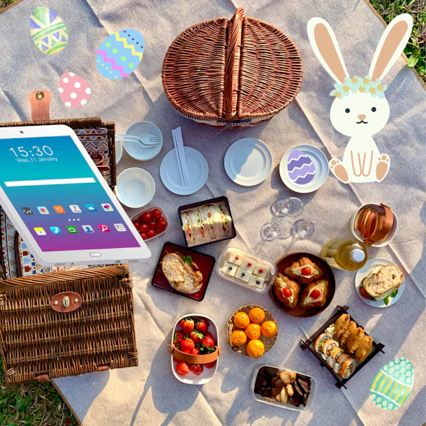 イースターバスケットにデバイスをつめて、屋外でのオンラインレッスン後に