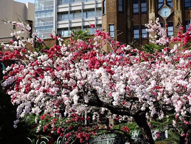 ゴシック建築のまえに咲く枝垂れ花桃。