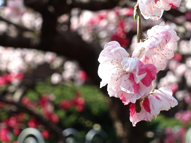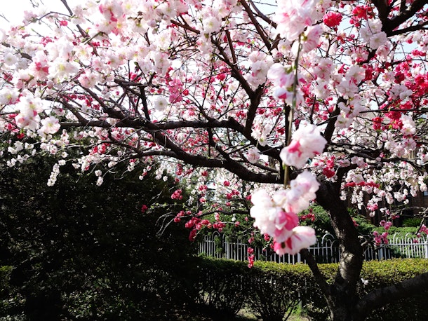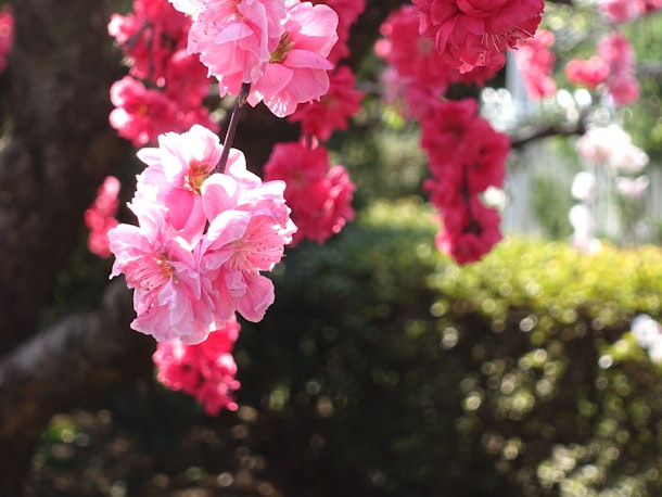 一本の木に、白と紅、紅白の絞りの3色を咲かせるハナモモ。