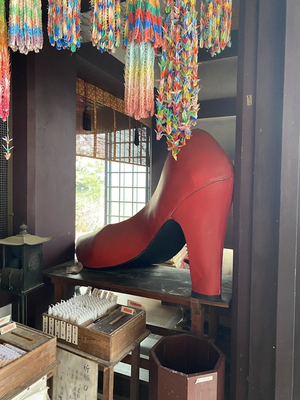 2m以上ある金のわらじや下駄、それに巨大なハイヒール等もまつってあり、面白いお寺さんです。