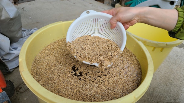 浮いた籾を取り除き、沈んだ籾を取り出して塩水を水で洗い流せば塩水選は完了です。