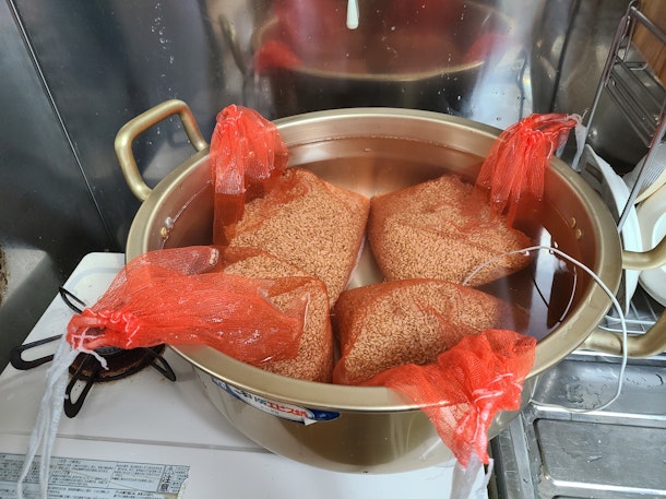 65℃位のお湯を用意し、先ほど塩水選を終えたばかりの籾を投入します。