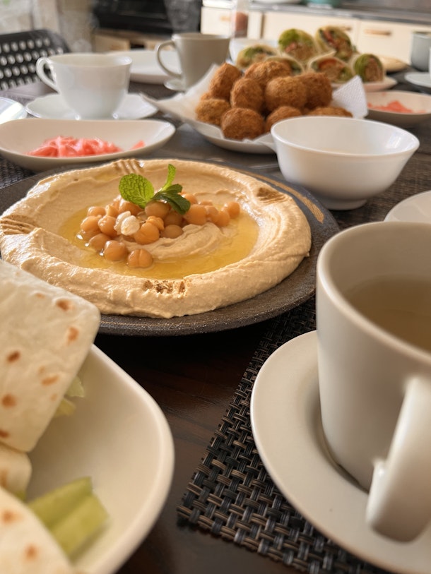 フムスは、中東地を中心特に(シリア、レバノン、パレスチナ、ヨルダン)に広く食べられている料理です。主な材料はひよこ豆、オリーブオイル、タヒニ(すりごまペースト)、レモン汁、塩、ガーリック、そしてしパプリカなどのスパイスです。これらの材料をすりつぶして滑らかなペースト状にし、パンや野菜などと一緒に食べるのが一般的です。