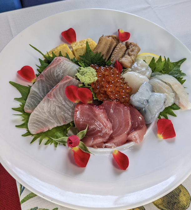築地の卵焼き、築地で煮たアナゴ、切りたてのマグロの脳天(トロみたいで美味しい)ブリにイクラにエビホタテ‥エディブルフラワーまで飾っちゃいました!