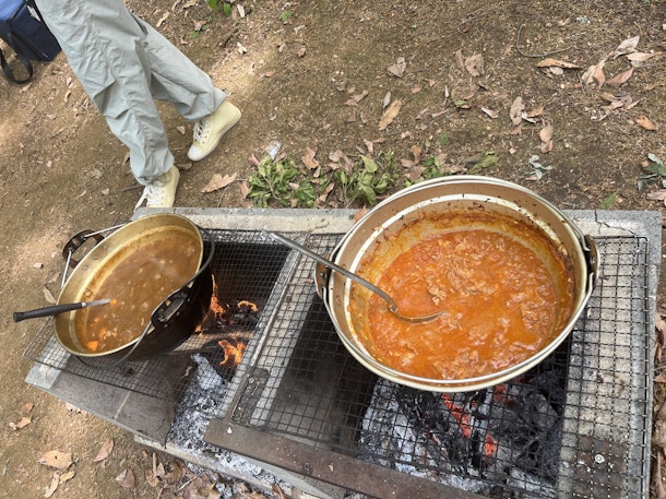 一緒に話して手を動かしてる中で色々なお話ができたり、カレーを作る中で変化や香りを感じたり、新緑の隙間から入る光が優しくて、気持ちよい! カレーは普通のルーを入れる鍋と、子どもでも食べられるスパイスカレー🍛!!! んもう、遊び回った後、外で食べるカレーは最高に美味しい😋