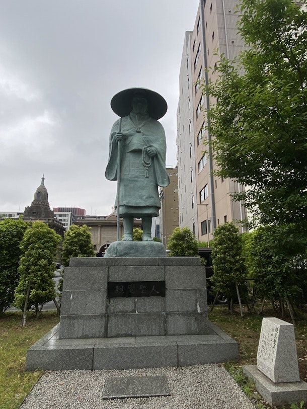 築地本願寺の親鸞聖人の銅像の前に集合!