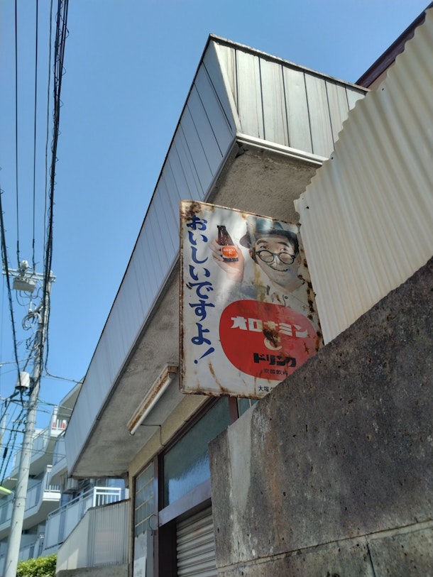 世田谷区羽根木。ダイタラボッチは見つからなかったけど、古い大村崑が写っているオロナミンCのホーロー看板が見つかったのである。