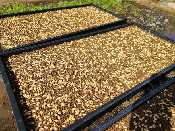 催芽(浸種の仕上げ作業、ぬるいお湯につける)