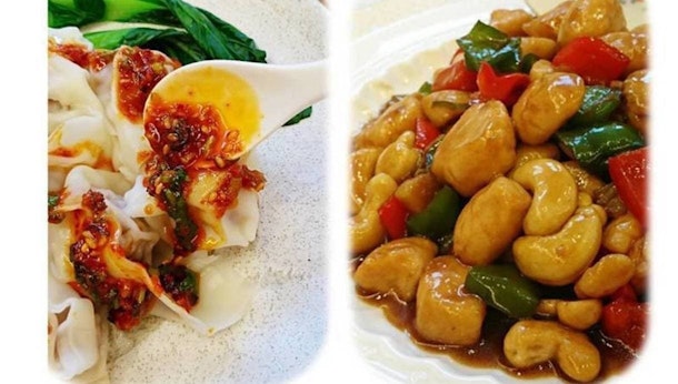 肉ワンタン、酸辣万能タレ、鶏肉カシューナッツ炒め、五香枝豆、干しエビ大根スープ、ココナツもち