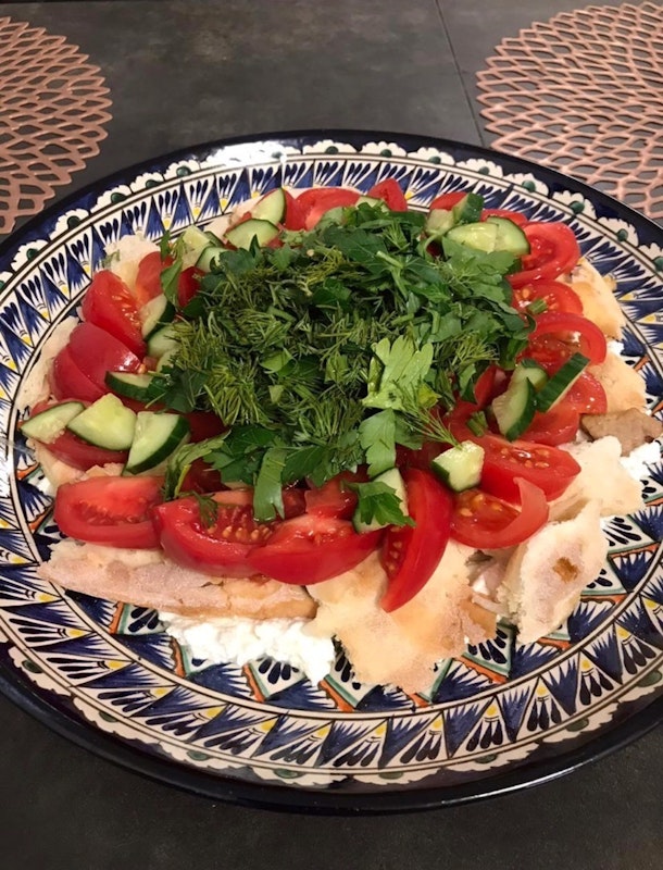 固くなったパンをちぎってヨーグルトをかけます。油で玉ネギを揚げて、それをヨーグルトがかけたものに置き、熱々油をかけたところで野菜を載せて完成です。味は酸っぱく甘く、野菜のうまみともになんとも不思議な味がします。油はサラダ油、ゴマ油やバターを使います。