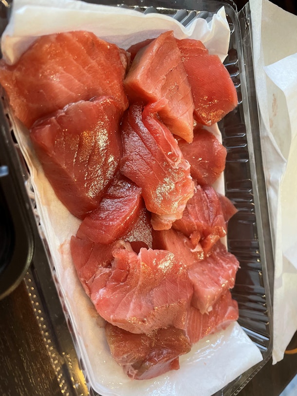 このマグロの刺身は、仲卸さんに頼んで作ってもらったものです。