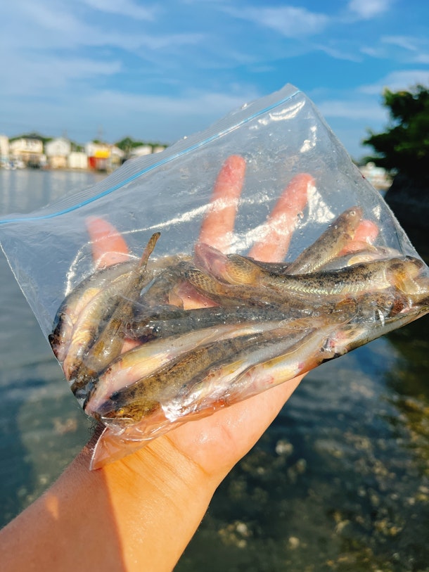 ▼8月お盆過ぎになると、天ぷらサイズのハゼが釣れるようになります。